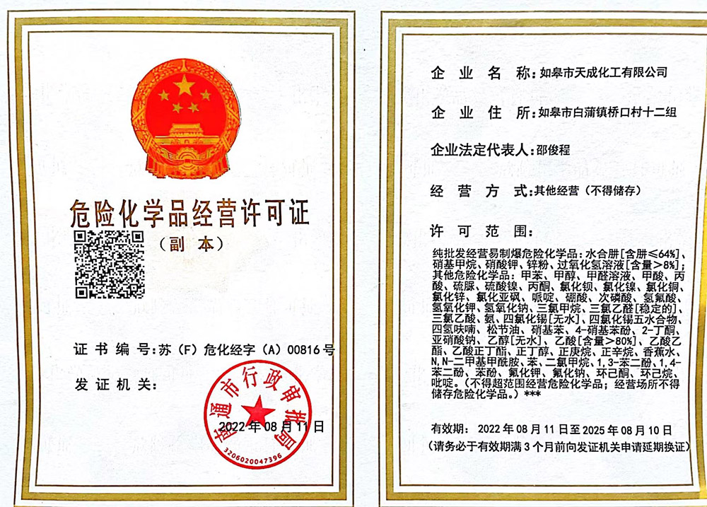 ? 如皋市天成化工有限公司創(chuàng)建于1996年。公司地處于美麗富饒的長江三角洲,座落在古鎮(zhèn)林梓,通揚運河河畔。南瀕長江、西臨204國道,距南通港、飛機場30公里,立體交通發(fā)達。公司經營管理規(guī)范,技術力量雄厚,擁有一批高、中級專業(yè)技術人才。